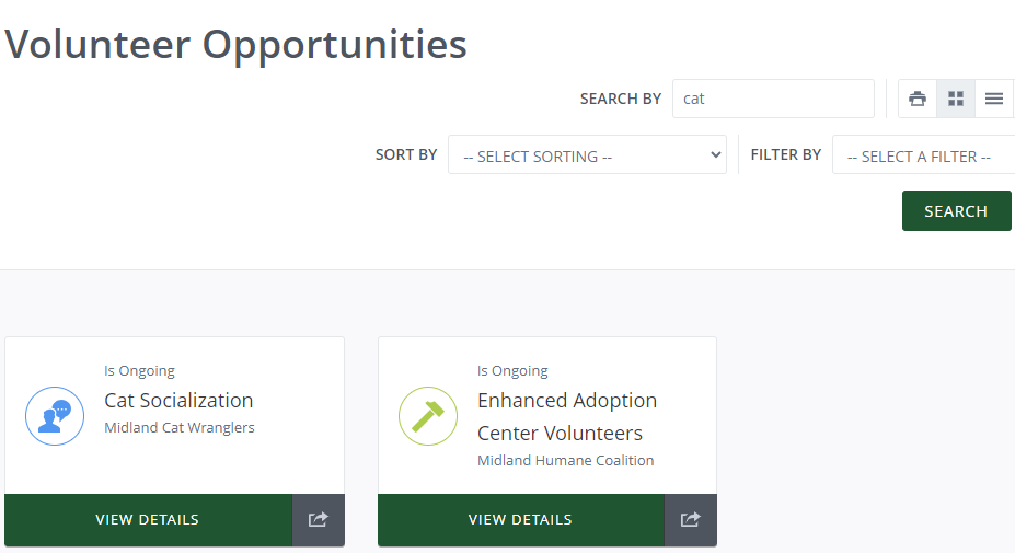 In “Volunteer Opportunities” put in whatever you are interested in, and it will pull a list of results for that! Make sure to call the organization to find out when is a good time. See example to the right: